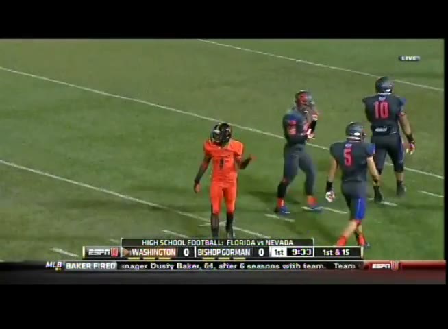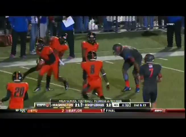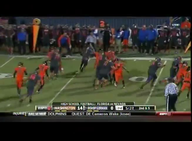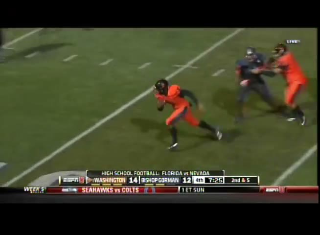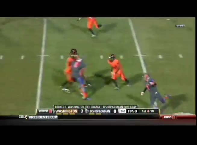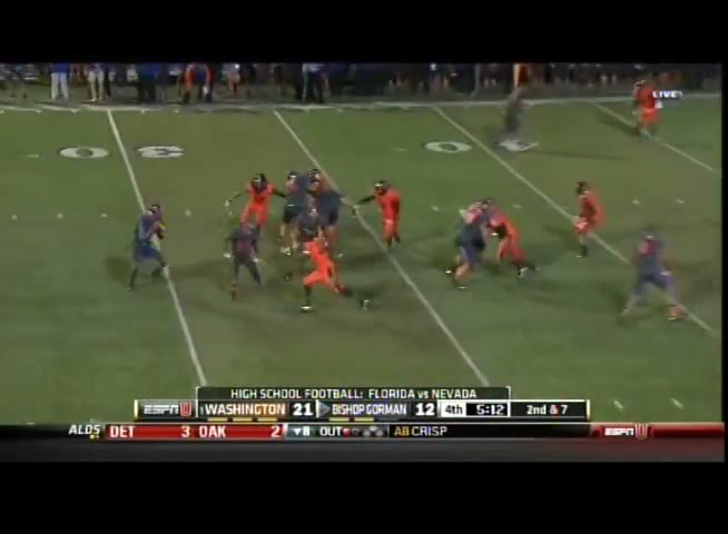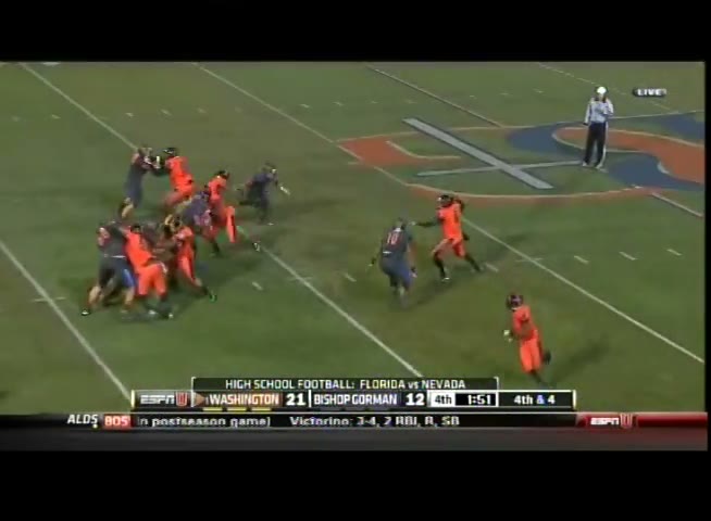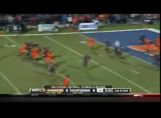 Hey Stewart, let's take a look at this Bishop Gorman vs. Booker T. Washington game from 2008. I want you to pay close attention to the way we handled their offense. Specifically, notice how our defensive line controlled the line of scrimmage and kept their running game in check.